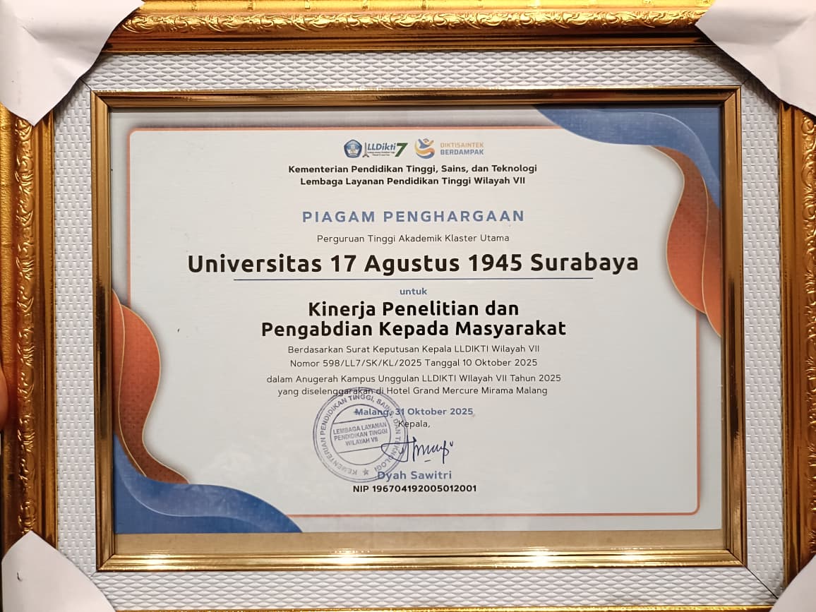 Untag Surabaya meraih Penghargaan dari LLDIKTI 7, atas Kinerja Penelitian dan Pengabdian kepada Masyarakat