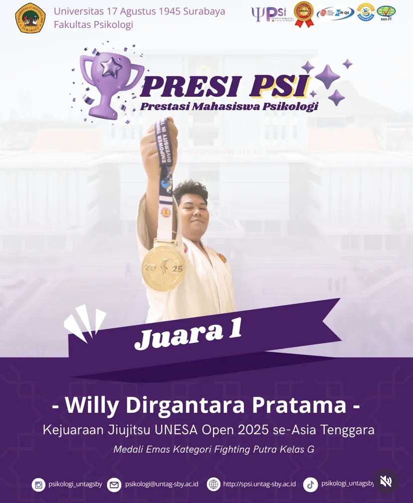 Prestasi Mahasiswa Fakultas Psikologi Untag Surabaya Juara 1 dalam Kejuaraan Jiujitsu UNESA Open 2025 se-Asia Tenggara