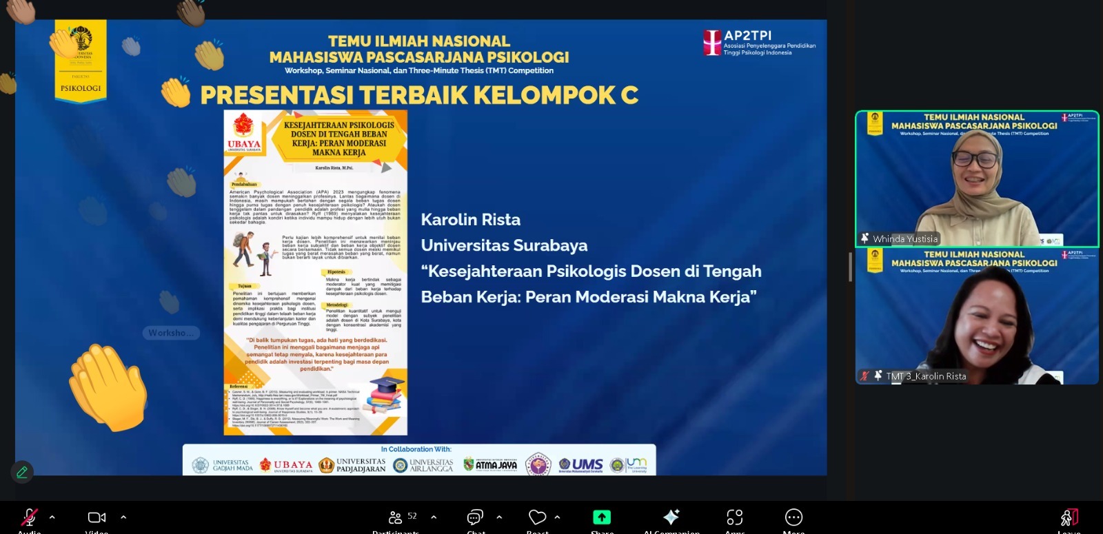 Dosen fakultas psikologi untag surabaya mendapatkan prestasi presentasi terbaik kelompok dalam kegiatan temu ilmiah nasional mahasiswa pascasarjana ps
